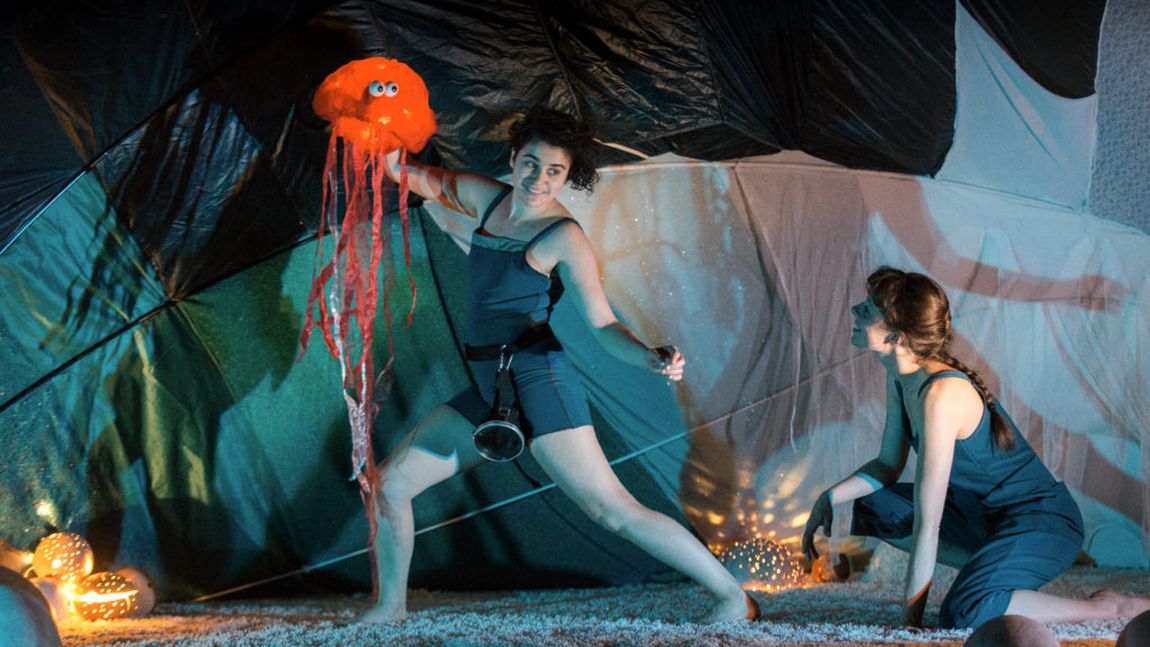 “Au Fond des Mers“ zeigt spielerisch die Entstehung von Leben und lässt das junge Publikum auf zauberhafte Weise abtauchen in eine dichte Atmosphäre einer Unterwasserwelt. Mit Licht und Schatten, Musik, Figuren aus der Meereswelt, fließenden Bewegungen und Choreographien nehmen die Taucherinnen die kleinen und großen Zuschauer*innen mit auf ihre fantasievolle Expedition auf dem Meeresgrund.